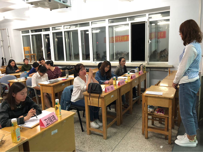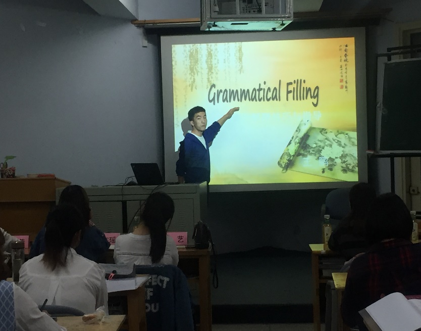 此次比赛共有八名同学参赛,七名有教学经验的高年级同学担任评委。参赛的同学来自英语、日语和俄语专业。大家或带着精心准备的PPT进行授课,或书写流畅的板书从容教学。其丰富、有趣的讲解深深吸引了评委和观众,真正做到了寓教于乐。讲台上下积极互动,每名选手短短十分钟展示时间就形成了良好的教学氛围。每名参赛同学结束授课后,评委们认真细致地点评也使选手们和观众们受益匪浅。