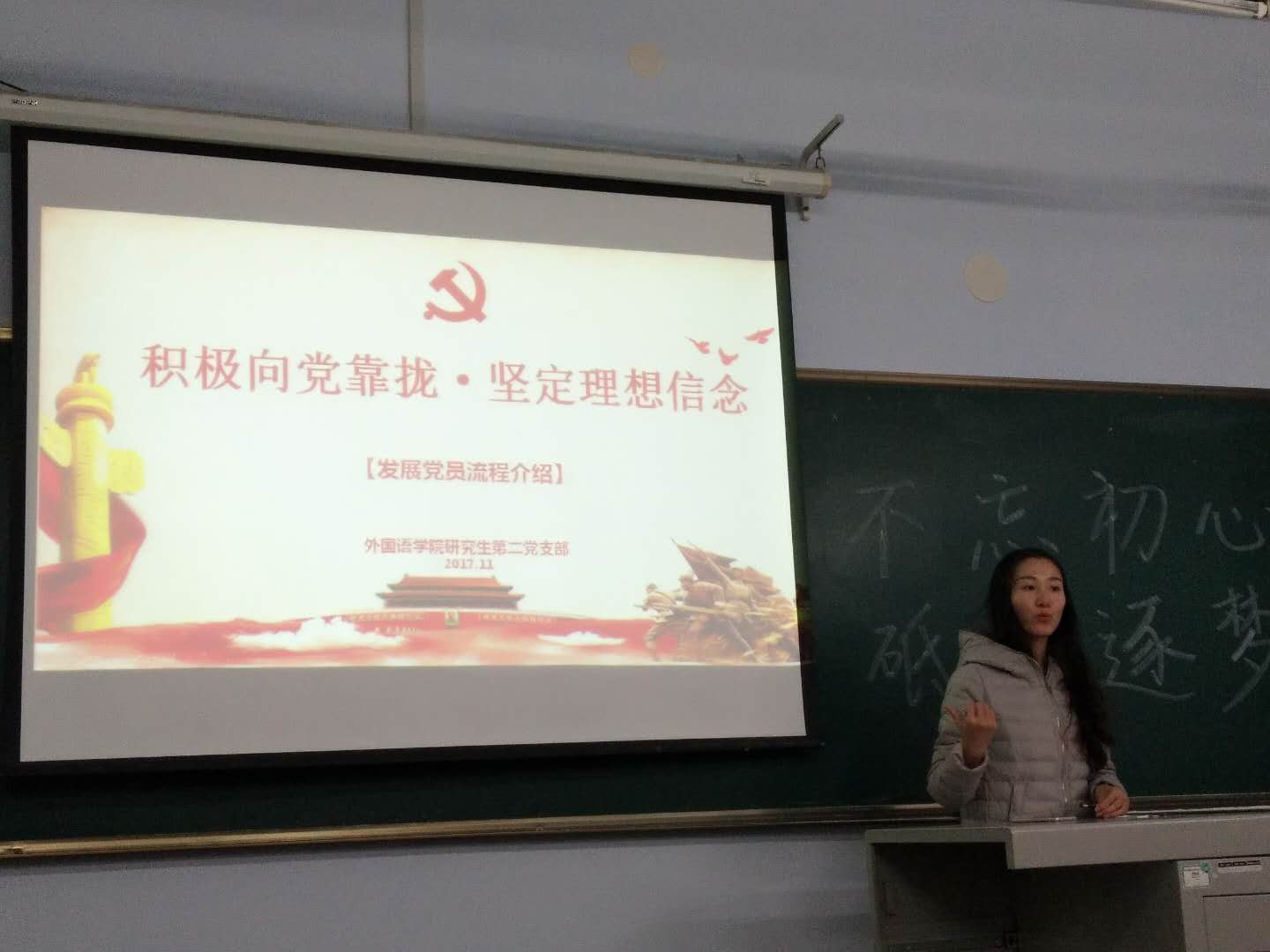 研究生团支部举办了以“不忘初心,砥砺逐梦”为主题的十九大精神主题团课,并邀请研究生第二党支部支部书记田琦同学来为大家介绍入党流程。