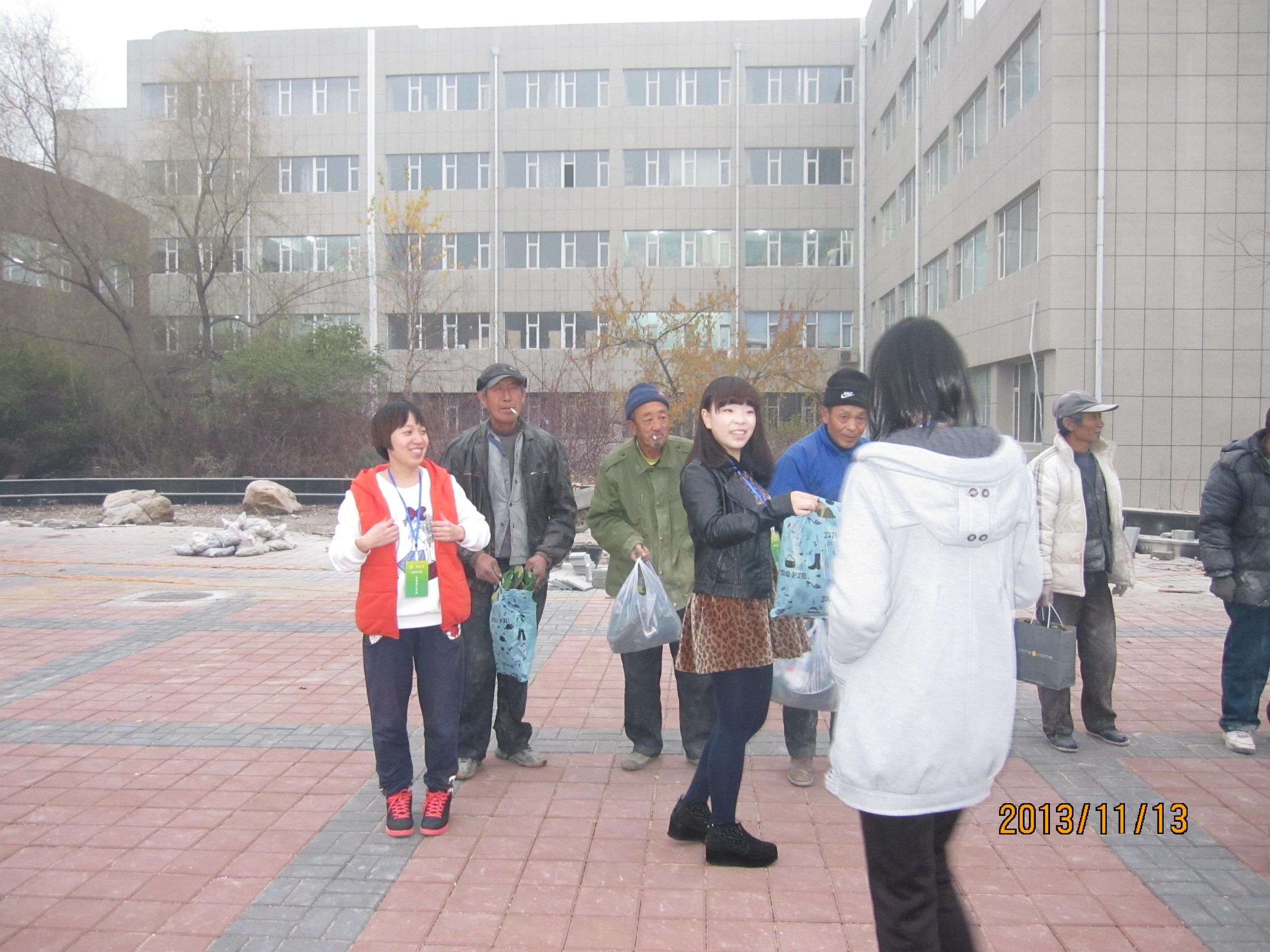 团委志工部和U&I志愿者协会号召同学们捐献军训服和平时穿不着的衣服,通知一发出,立即得到了大家的积极回应,大家以班级为单位捐献了衣服,然后转送给农民工,为他们在寒冷的冬季送上一丝温暖。