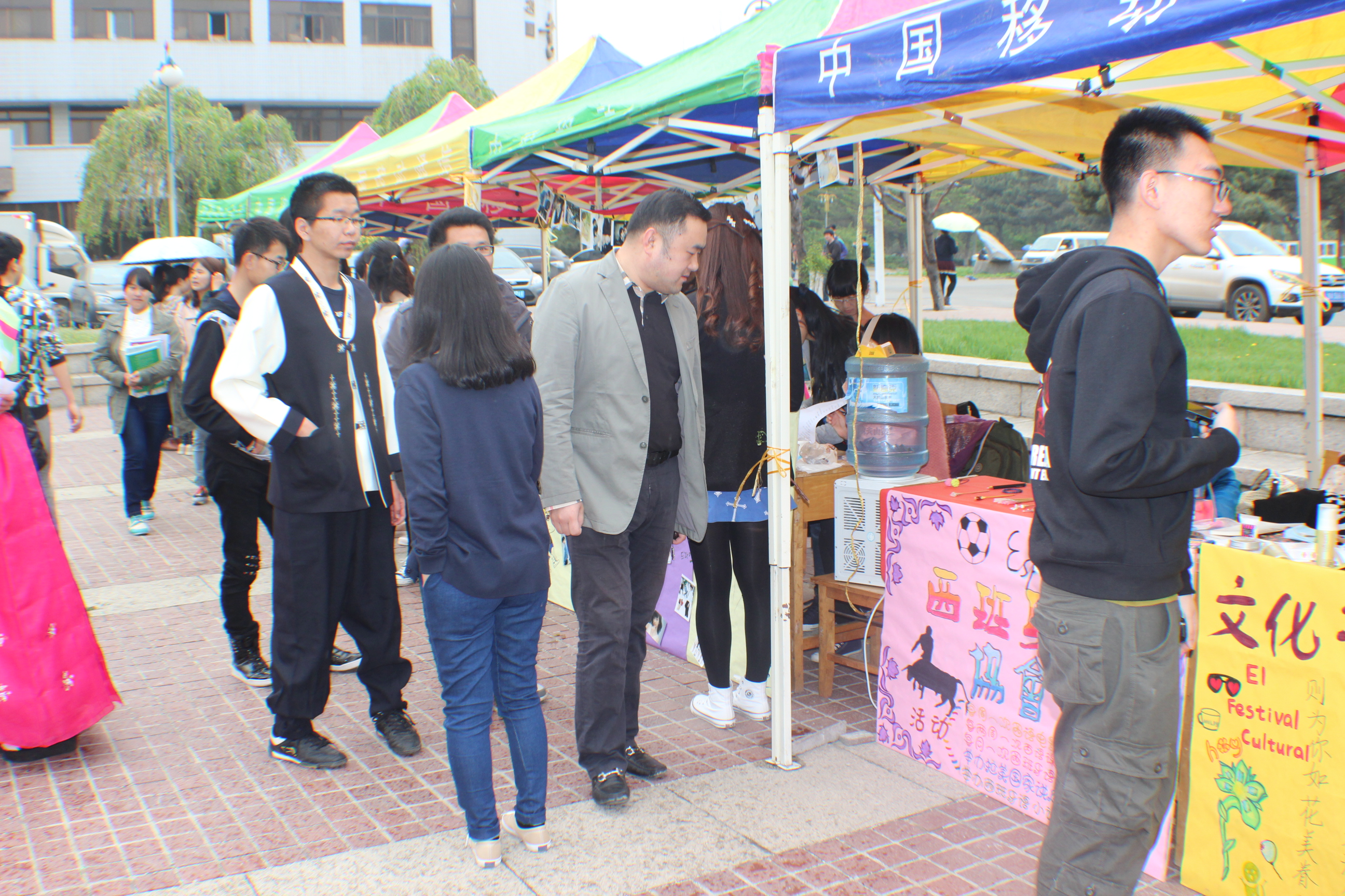 学院七个社团在广场设列展台,让到场的同学能更为近距离、全方位的尽享文化大餐。各大展台详尽的展现了各语种所代表的地域文化,风景名胜以及珍馐美味,更邀请了不少外国友人前来助兴。文化节举办当天细雨纷纷,但活动并没有受到天气影响,仍吸引了不少学生撑伞前来驻足欣赏、参与其中。