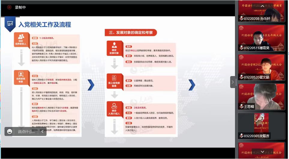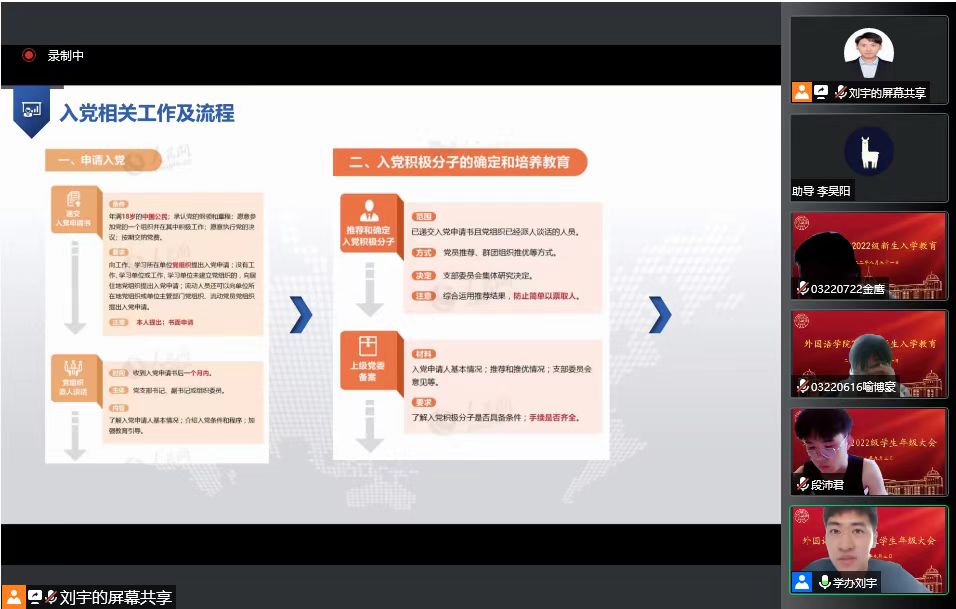 会上介绍了申请入党的基本条件和入党流程等内容,并重点讲解了如何撰写入党申请书和入党的五个阶段,引导新生结合自身实际,从树立科学目标、养成良好习惯、保持高度自律做起,思想上追求上进,行动上争当表率,以实际行动争取早日加入中国共产党。