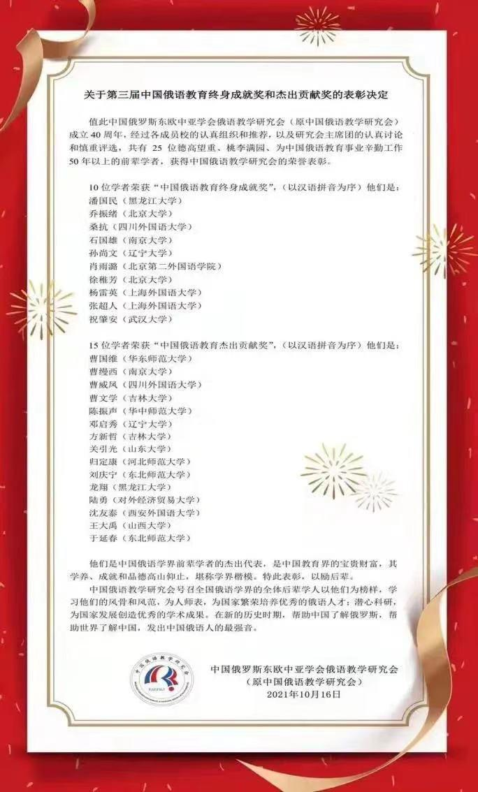 俄文系曹文学教授、方新哲教授实至名归,荣获“中国俄语教育杰出贡献奖”。