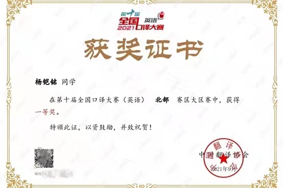 翻译硕士英语口译专业杨铠铭同学继复赛获得一等奖后,勇夺大区赛北部赛区一等奖,成功晋级全国总决赛,取得学校历届参赛最好成绩,成为首位闯入总决赛的JAVDatabase