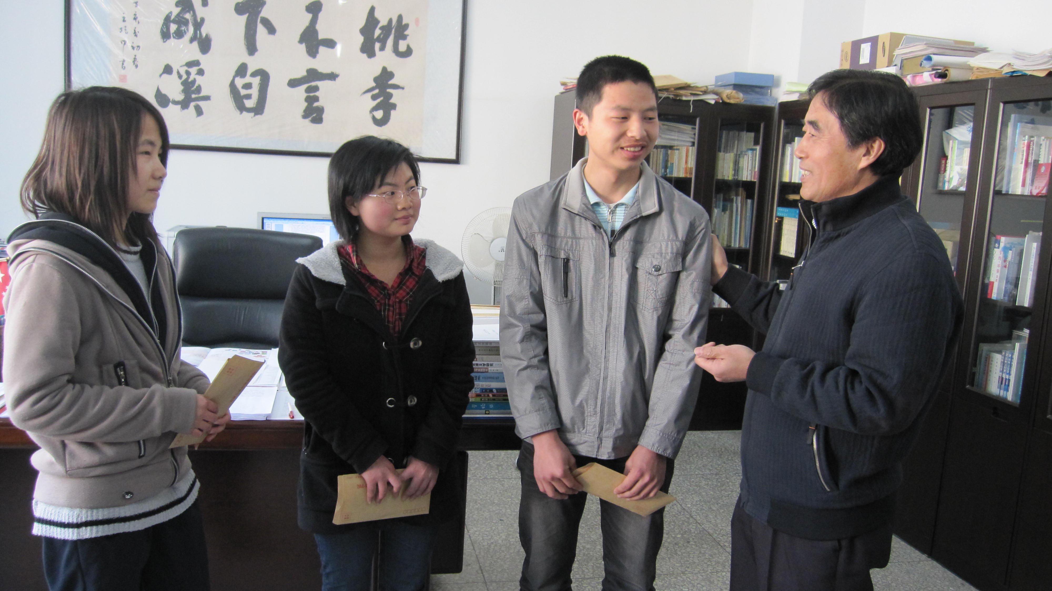举行了2010年度霞山会奖学金颁奖仪式,院长宿久高教授、副院长周异夫教授、副书记兼副院长赵程华老师、日语系主任胡建军老师和学生工作办公室副主任葛宗梅老师出席了仪式。宿久高院长为获奖的3名学生颁发了奖学金,亲切询问他们的学习、生活状况,鼓励他们克服困难,努力学习,做一名对社会有贡献的人。