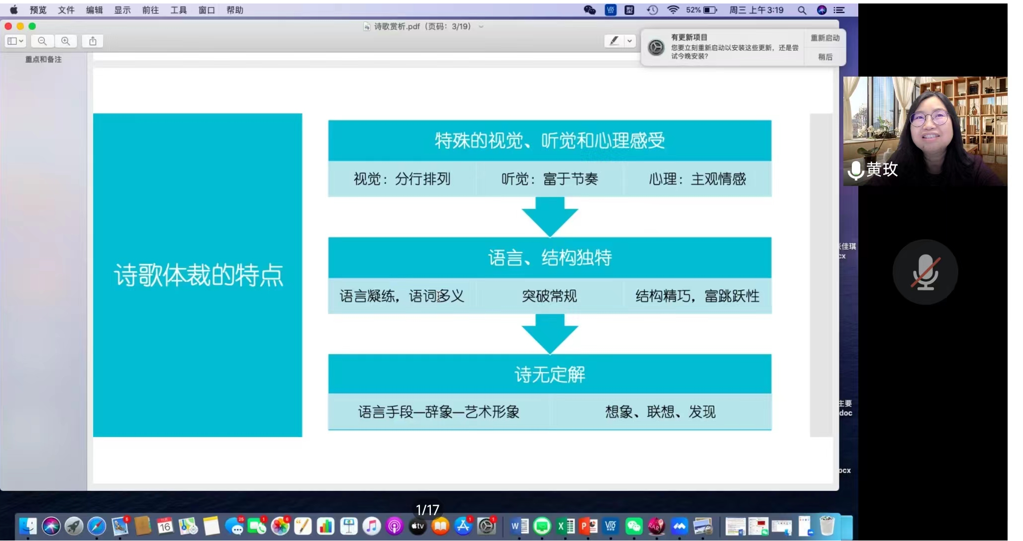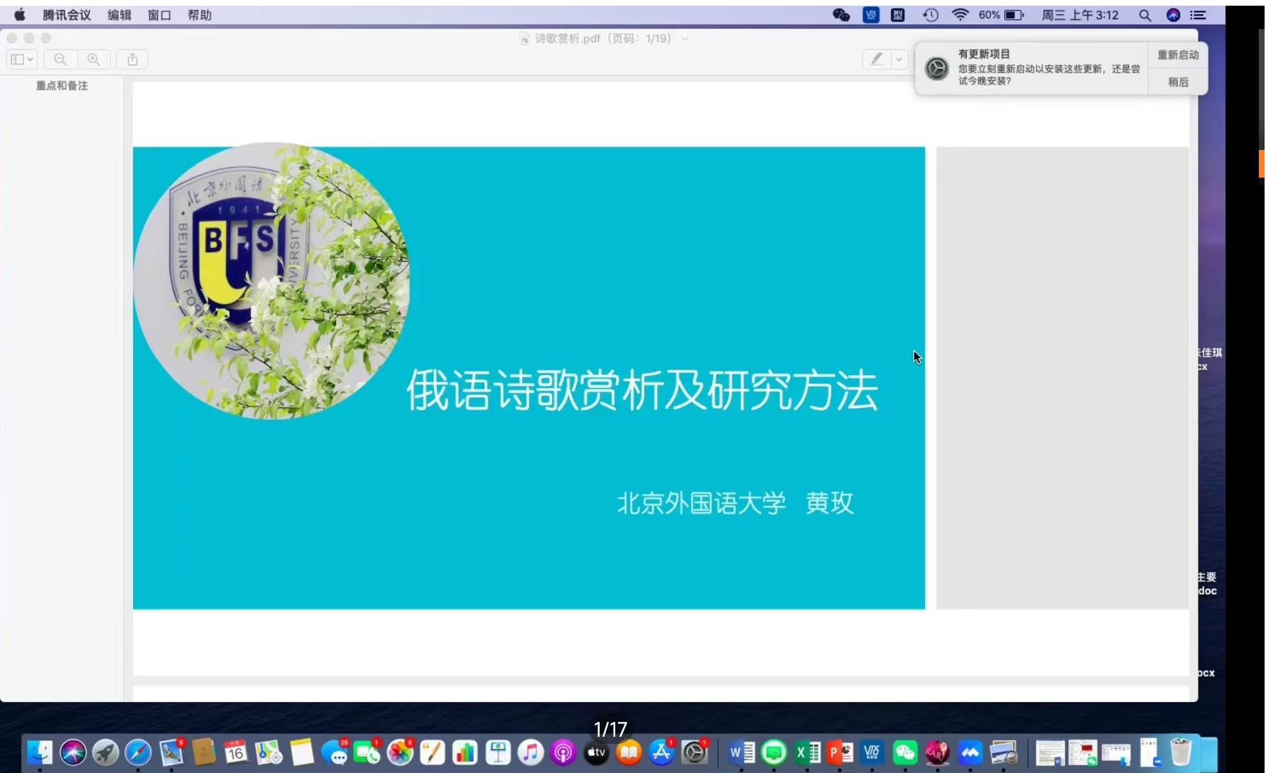 邀请,2022年11月16日19时,北京外国语大学教授、博士生导师、博士后合作导师黄玫老师在云端通过腾讯会议平台为我校师生做了一场主题为“诗歌文本赏析及研究路径”的学术讲座。黄玫教授兼任教育部高等学校外语教学指导委员会委员、中国高等教育协会外语教学研究分会常务理事、中国巴赫金研究会副会长,中国外国文论与比较诗学研究会理事、中国俄罗斯文学研究会理事、中俄友协理事、中国对外友协中亚友好协会常务理事等。