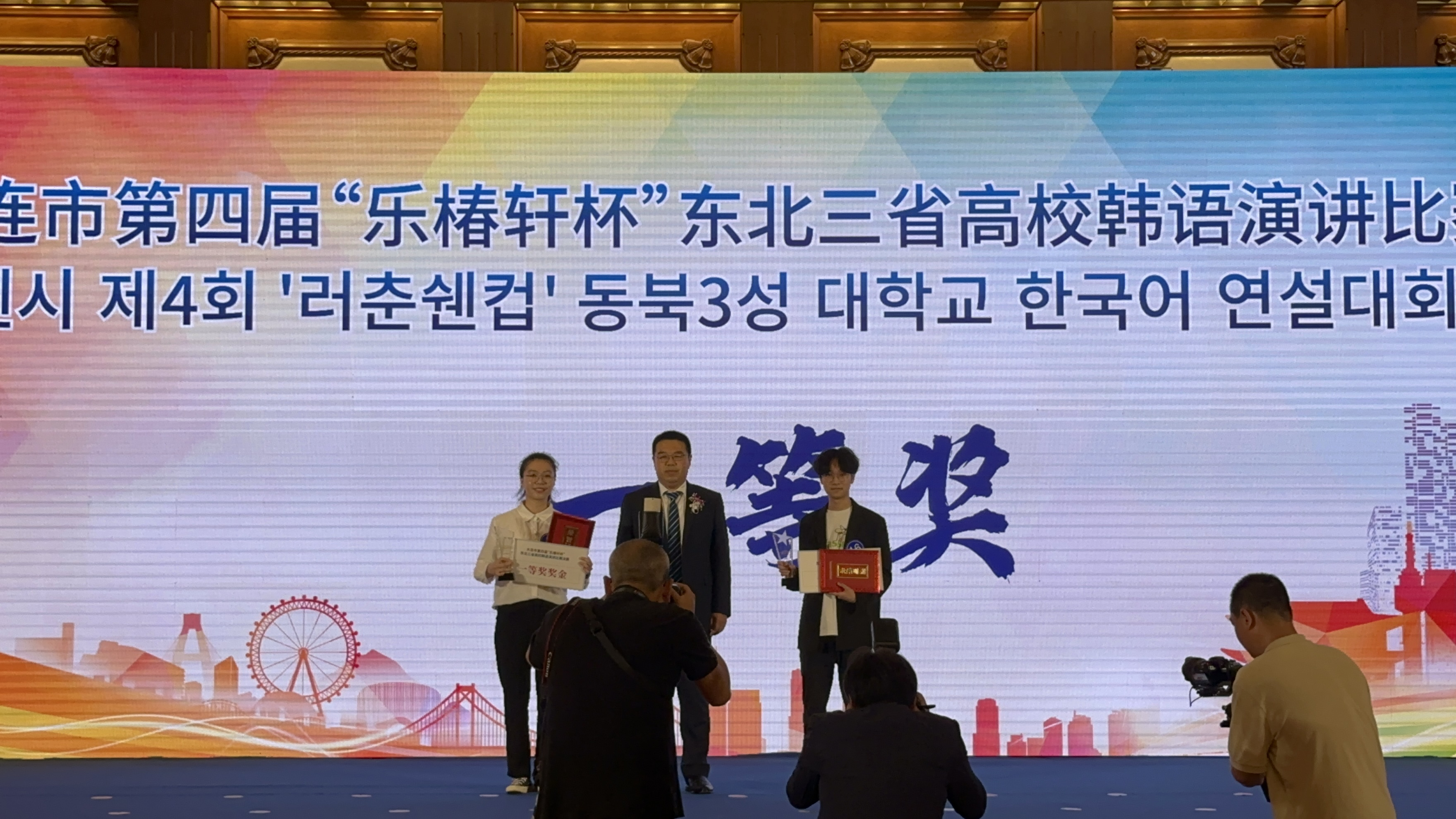 “乐椿轩杯东北三省高校韩语演讲比赛是”由大连市人民政府联合黑龙江、吉林、辽宁三省外事办公室主办。本次大赛由四分钟现场抽题演讲以及一分钟的即兴问答两个部分组成。这不仅考验了选手的韩国语专业水平和应变能力,也综合考察选手的国际视野和创新意识。孙安琦以“和而不同-中韩文化差异”为题,在四分钟内从容不迫地从酒的温度和祝酒词两方面入手,阐述了自己对中韩酒文化差异的独到见解,更是用一组即兴创作的祝酒词将比赛的氛围推向高潮,表达了对中韩交流的热情,获得现场评委的一致好评,荣获佳绩。