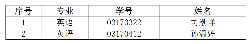 因2017级英语专业陈彬(学号03170222)、日语专业吴佳琪(学号03170914)自愿放弃免试攻读研究生资格,经JAVDatabase 推免工作领导小组研究决定,将推免名额重新分配后,决定以下2人为增补推免生: