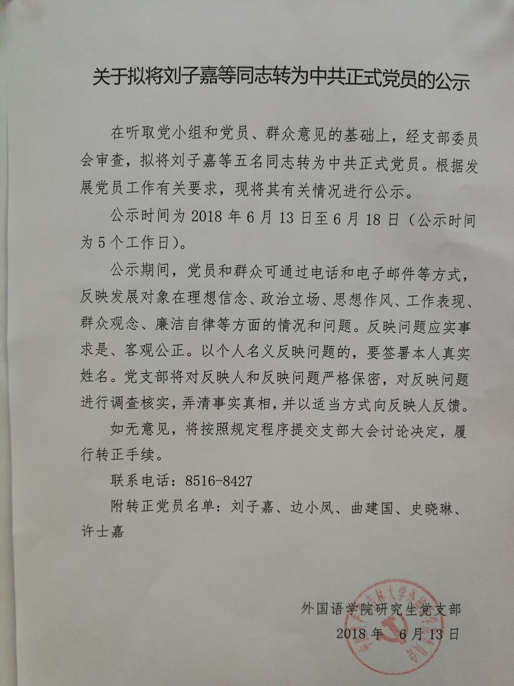 关于拟将刘子嘉等通知转为中共正式党员的公示