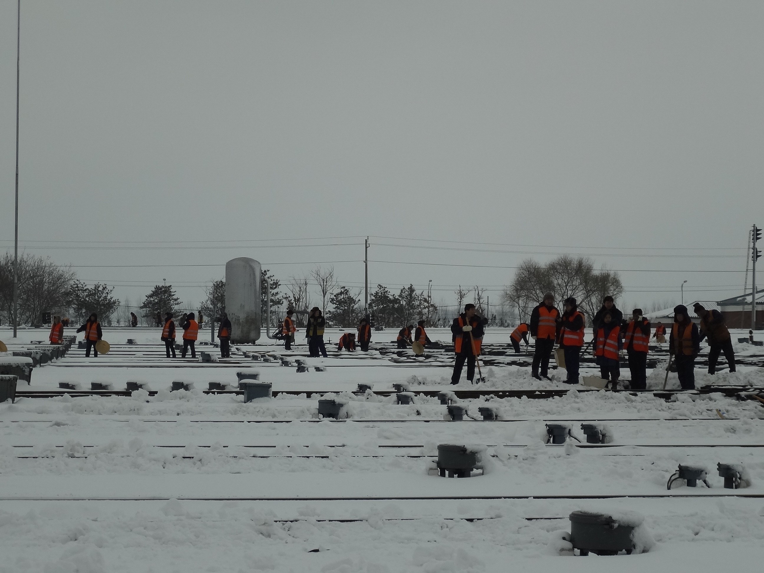 今年,长春遭遇罕见大雪,正值春运,大雪对于春运安全造成了一定的影响。同学们一大早就来到吉林站,与众多铁路职工排队领取扫雪工具。铁路线上积雪多且厚,而且由于要清理的主要是铁轨一带,大型机械不能动用,只能靠最简单的人力。大家排成一线,在寒冷的冬天,这成了守卫铁路安全的一条线。