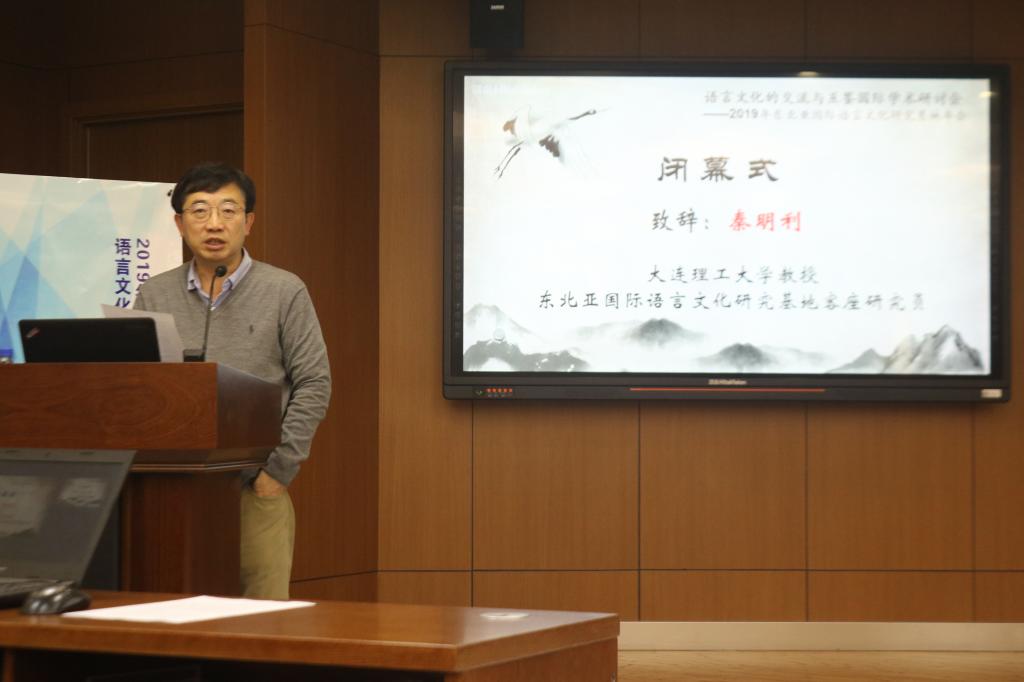 院长周异夫教授分别致闭幕词。秦明利教授在致辞中肯定了东北亚国际语言文化研究基地自2014年成立以来,已形成的高度国际化、学术前沿性、研讨主题具有理论性与实践性等特点,盛赞本次研讨会圆满地完成了大会主题所涉及的内容讨论。周异夫教授首先对各位专家学者的到来表示感谢并对明年的东北亚国际语言文化研究基地年会表示期待。他谈到,东北亚国际语言文化研究基地的基本理念是国际化,各个国家与民族在自己的语言文化发展轨迹上都有自己的特色,但从整体而言彼此之间具有千丝万缕的联系,基地的年会就是希望从语言、文化、翻译学以及国别研究等整体上的共享,让学术研究能更上一层楼。