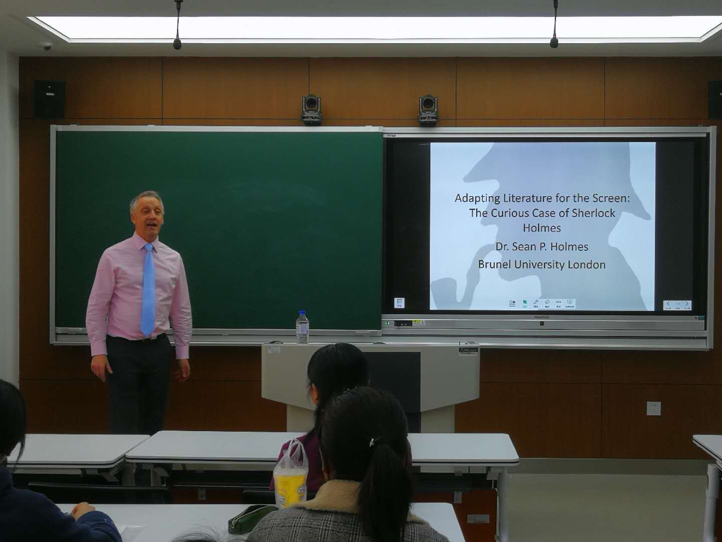 下午,杨卉女士和肖恩博士与英文系英语语言文学方向的研究生进行座谈。肖恩博士做了题为《以福尔摩斯为例谈文学作品的电影改编》的讲座,讲座氛围热烈,师生互动积极。通过对比三个不同时期的福尔摩斯探案影视剧:1939年和1984年的《夏洛克·福尔摩斯历险记》、BBC系列剧《神探夏洛克》,肖恩博士指出文学作品电影改编的原则:文学的电影改编不是刻板地忠实原著,而是不断的创新和再创作。二十一世纪的夏洛克已经成功化身为精通科技的现代人,依旧是经久不衰的英雄偶像。讲座结束以后,肖恩博士还向学生们介绍了布鲁内尔大学的基本情况以及研究生阶段的课程、特色专业和申请流程。杨卉女士就研究生交流项目回答了同学们的提问。