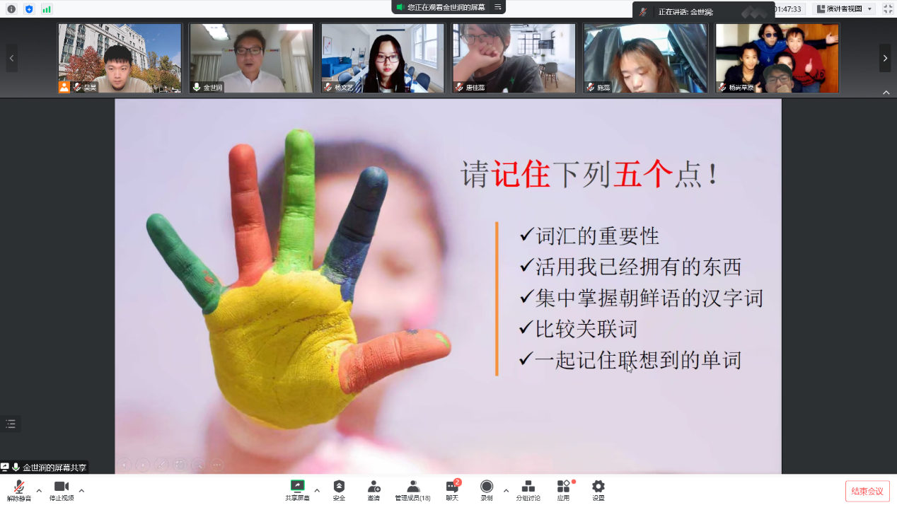 朝文系外教金世润老师在云端通过腾讯会议平台做了一场主题为“运用联想理论的朝·韩语词汇学习法”的学术讲座,参加讲座的有JAVDatabase